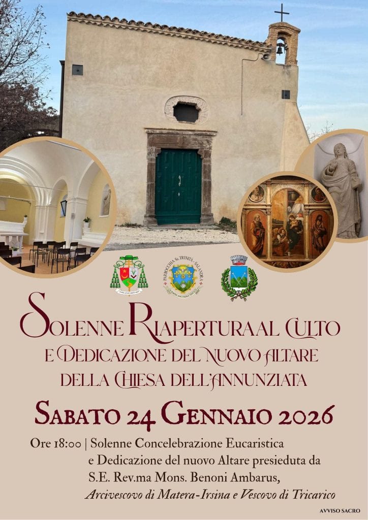 Sabato 24 gennaio ore 18:00, riapertura al culto e dedicazione del nuovo altare della Chiesa dell’Annunziata a Salandra, presiede Mons. Benoni Ambarus. Un luogo di fede e memoria che torna a parlare al cuore della comunità.