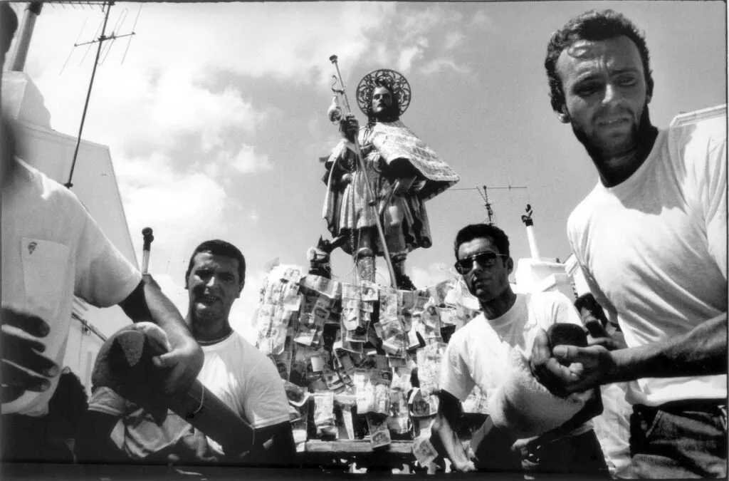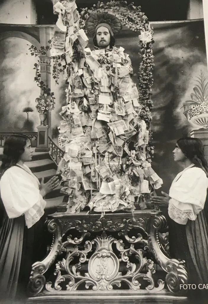 Dietro la statua del santo procedevano i muli caricati con dei sacchi di grano o di paglia che venivano offerti al santo. Un’altra particolarità: le offerte in denaro o in monili d’oro attaccate su nastri o fermate con degli spilli sul mantello di Rocco. L’unica parte della statua che rimaneva scoperta era la testa. Due giorni dopo, il 18, il fedele che aveva apposto dei preziosi alla statua li andava a riscattare, valutati secondo il valore dell’oro di quel giorno.