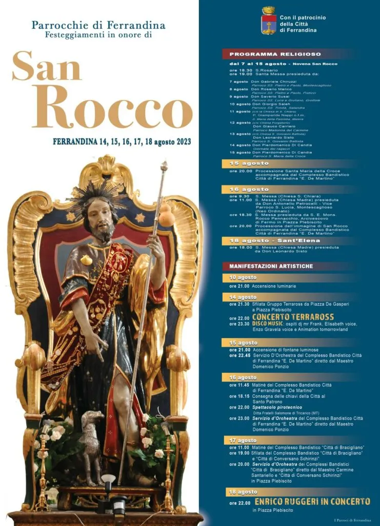 Noi facciamo festa perché è già esistito qualcuno che ha saputo “fare della propria vita un capolavoro”: San Rocco! Festeggiare il nostro Santo patrono è tornare a riflettere sul bene che Dio, in Gesù Cristo, può compiere nella vita di ognuno. Rocco di Montpellier ha saputo svestirsi le caratteri di eccessiva umanità per rivestire gli abiti della santità che altro non è che il coraggio e la capacità di inondare ogni angolo della propria esistenza della luce che il Signore ci offre.