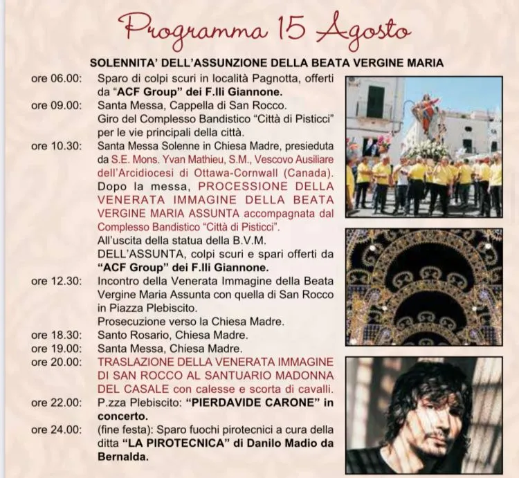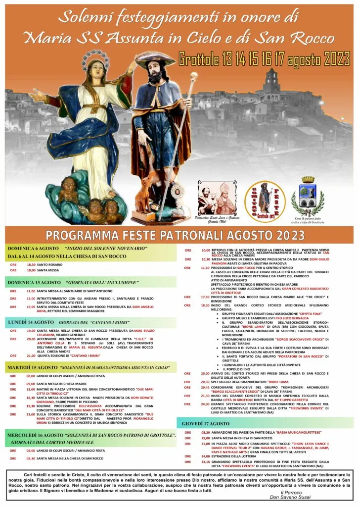 Invocando l’intercessione e la benedizione di Maria SS. dell’Assunta e di san Rocco, auguro a tutti, “Buona Festa”.