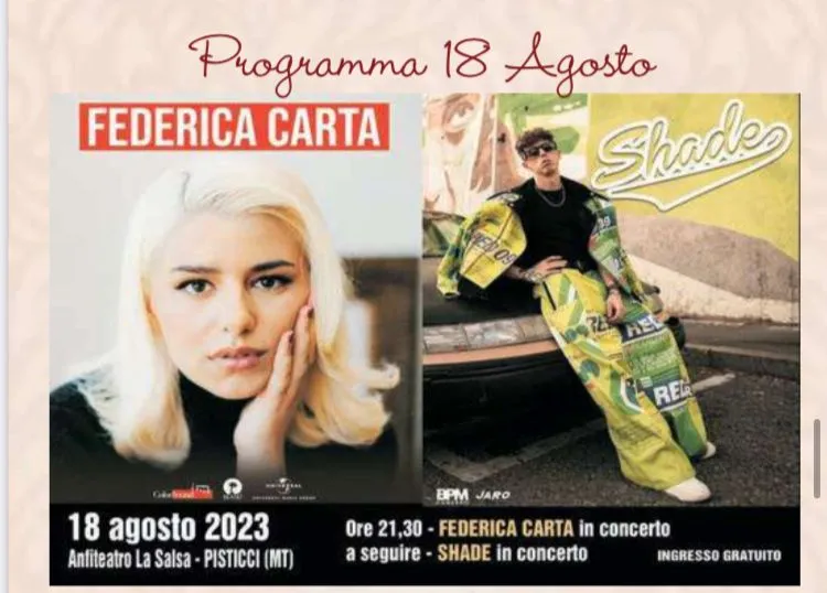 Negli ultimi anni si sono aggiunti cantanti di musica leggera che chiudono le festività il 18 agosto. Quest’anno, nell’Anfiteatro “La Salsa”, si esibiranno Federica Carta e Shade.