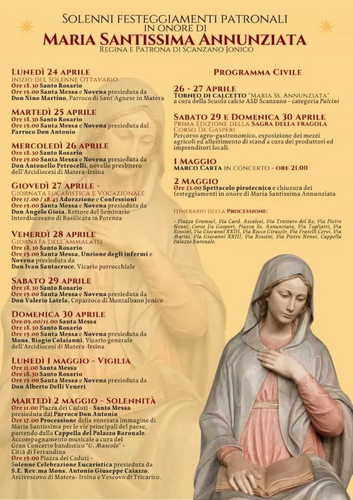 La comunità di Scanzano Jonico sta vivendo in questi giorni uno degli appuntamenti annuali più importante della sua vita religiosa e sociale: i festeggiamenti Patronali in onore di Maria Santissima Annunziata.
