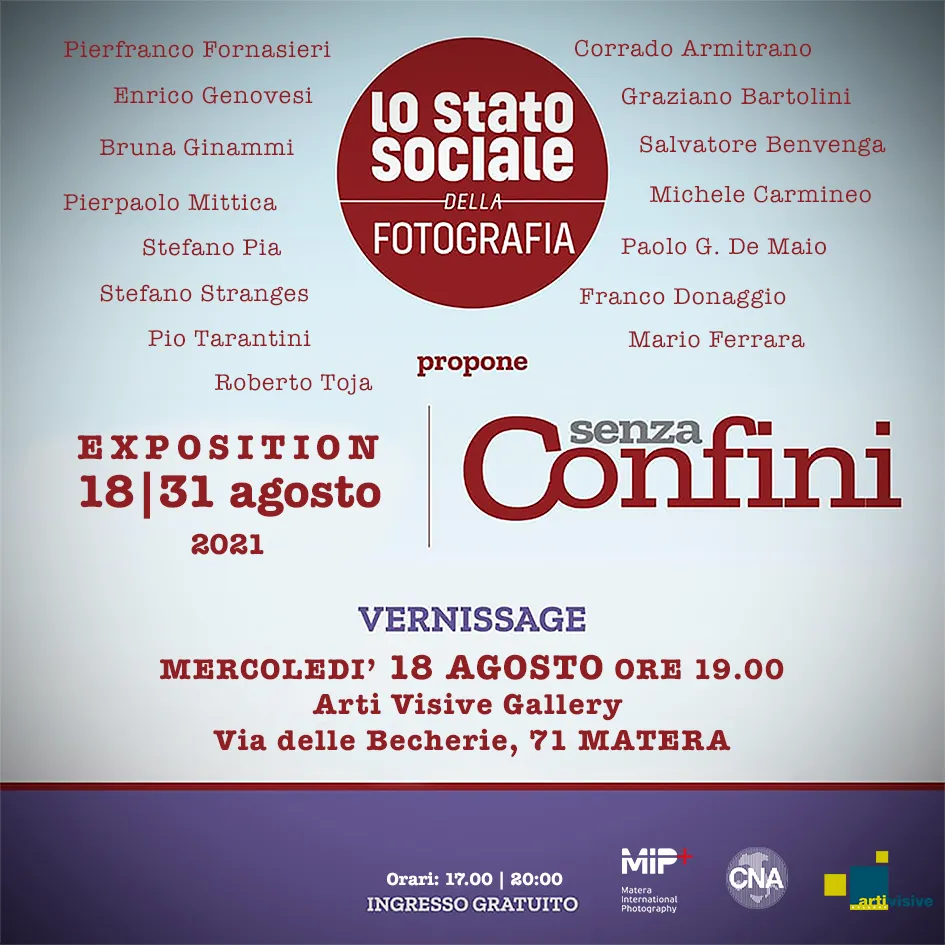 Rimarrà aperta fino al 31 agosto tutti i giorni tranne il lunedì dalle 17 alle 20 la Mostra Fotografica “Senza confini” (ideata, realizzata e organizzata da Matera International Photography, Lo Stato Sociale della Fotografia, Studio Arti Visive Gallery e CNA) nello Studio Arti Visive Gallery (via delle Beccherie, 41) di Matera.