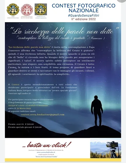 In collegamento On linee dalla Domus Pacis in Assisi, sabato 4 giugno 2022 dalle ore 12,00 13,00, si terrà la Cerimonia di Premiazione della II^ Edizione del Concorso Fotografico indetto dalla Fondazione Junipero Serra per gli Under 21 e dal Distretto 73 Puglia Basilicata Serra Italia Over 21 a cui il Serra Club di Matera ha aderito e si è classificato al primo posto con AISHA CASTRIA Under 21.