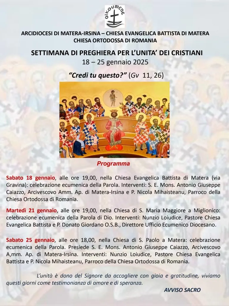In questa prospettiva ecumenica, siamo invitati a vivere questi giorni di preghiera e di riflessione, concentrandoci sul significato del credere e su come alimentare la vita di fede, personale e comunitaria, al fine di essere autentici testimoni nel mondo che solo nel Signore Gesù c’è la Risurrezione e la Vita.