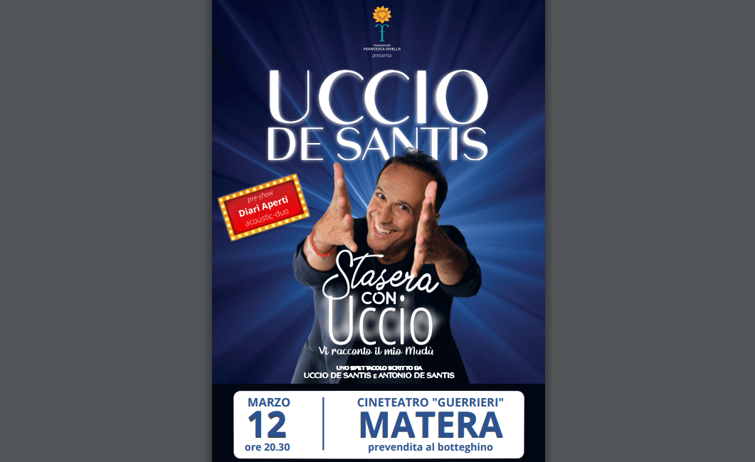 Domenica 12 marzo, alle ore 20.30, sul palcoscenico del cineteatro comunale “Gerardo Guerrieri”, a Matera, salirà Uccio De Santis.