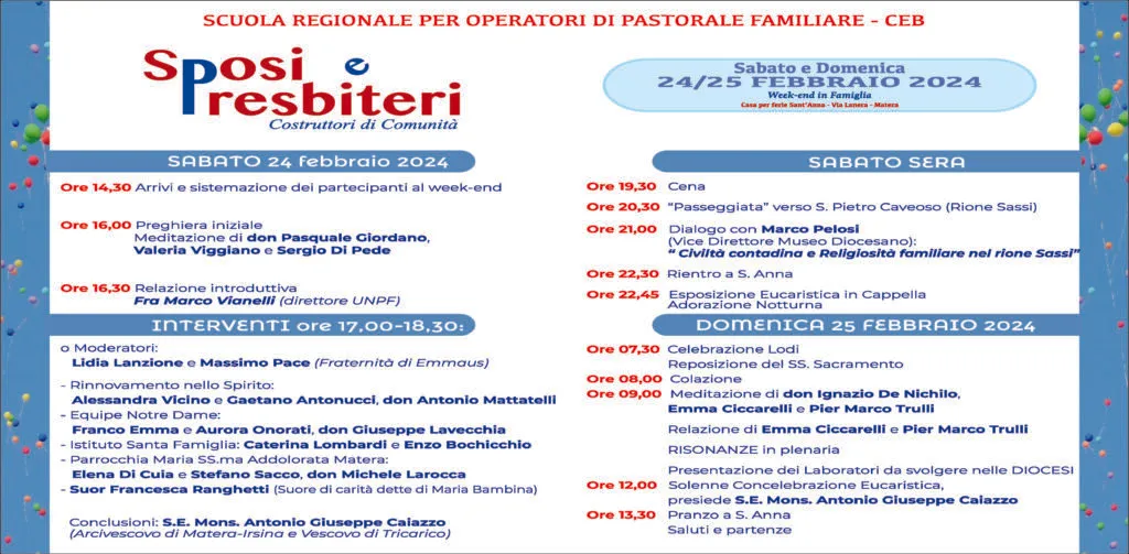 La risposta è nel titolo dell’incontro che la Scuola regionale di formazione per operatori di pastorale familiare ha organizzato a Matera, in collaborazione con la CEB (Conferenza Episcopale di Basilicata) nei giorni di sabato 24 e domenica 25 febbraio 2024: – Sposi e Presbiteri: costruttori di comunità -.
