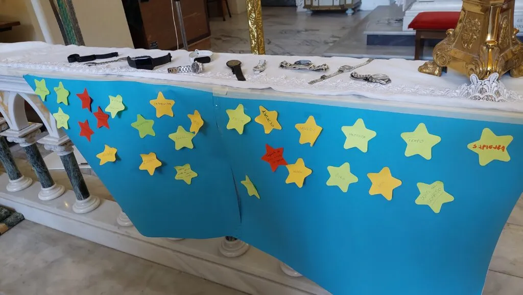 Non di meno, come i magi hanno portato un dono al Signore, anche ai nostri ragazzi è stato chiesto di allenarsi a riconoscere in cosa possono essere loro stessi dono. Così, hanno scritto su una stellina adesiva che hanno posto su un cielo azzurro la capacità che li rende principalmente dono.