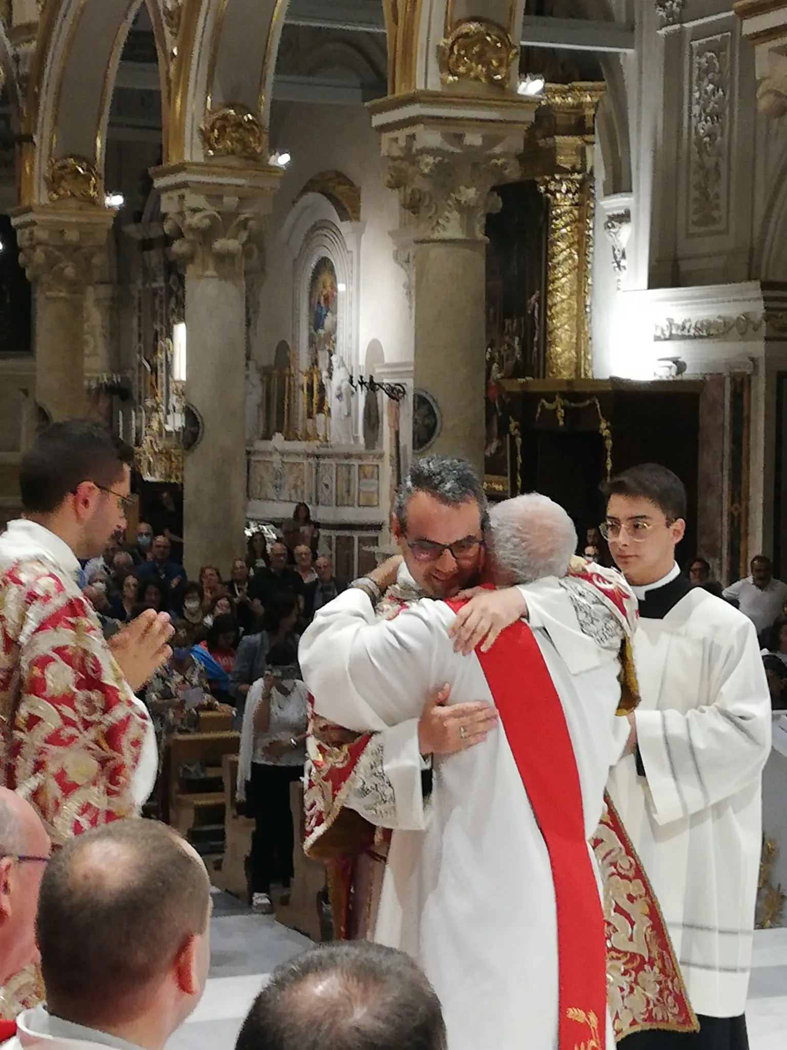 Quindi il rito della vestizione con la stola e la dalmatica, insegne diaconali, a cui sono seguiti – tutti carichi di commozione – gli abbracci, prima con l’Arcivescovo – come dal rito è previsto -, poi con gli altri Diaconi, confratelli in questo nuovo ministero.
