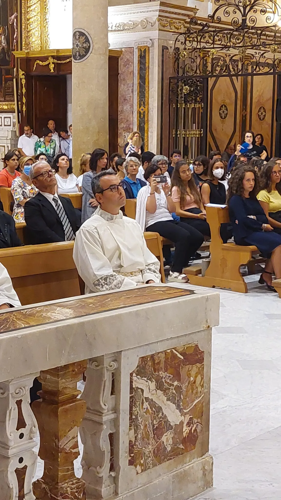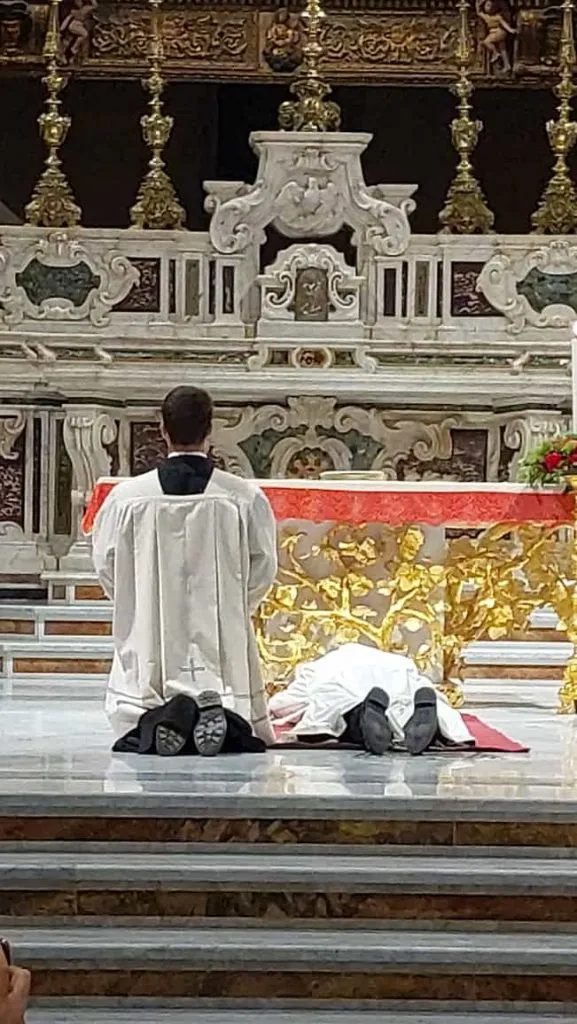 Un clima di attesa e silenzio orante nell’assemblea, pronta – dopo l’omelia – al rito di ordinazione vero e proprio: il dialogo tra Arcivescovo e Stefano scandito, in un climax ascendente, dalle sue cinque risposte “Sì, lo voglio”, poi “Sì, con l’aiuto di Dio lo voglio” e infine – con le proprie mani congiunte in quelle dell’Arcivescovo – “Sì, lo prometto”, la prostrazione – accompagnata dal canto delle litanie dei santi – che dice la resa incondizionata di Stefano alla volontà di Dio, e infine il cuore del rito: l’imposizione delle mani del vescovo e l’epiclesi (la preghiera consacratoria) su Stefano, da questo momento in poi don Stefano.