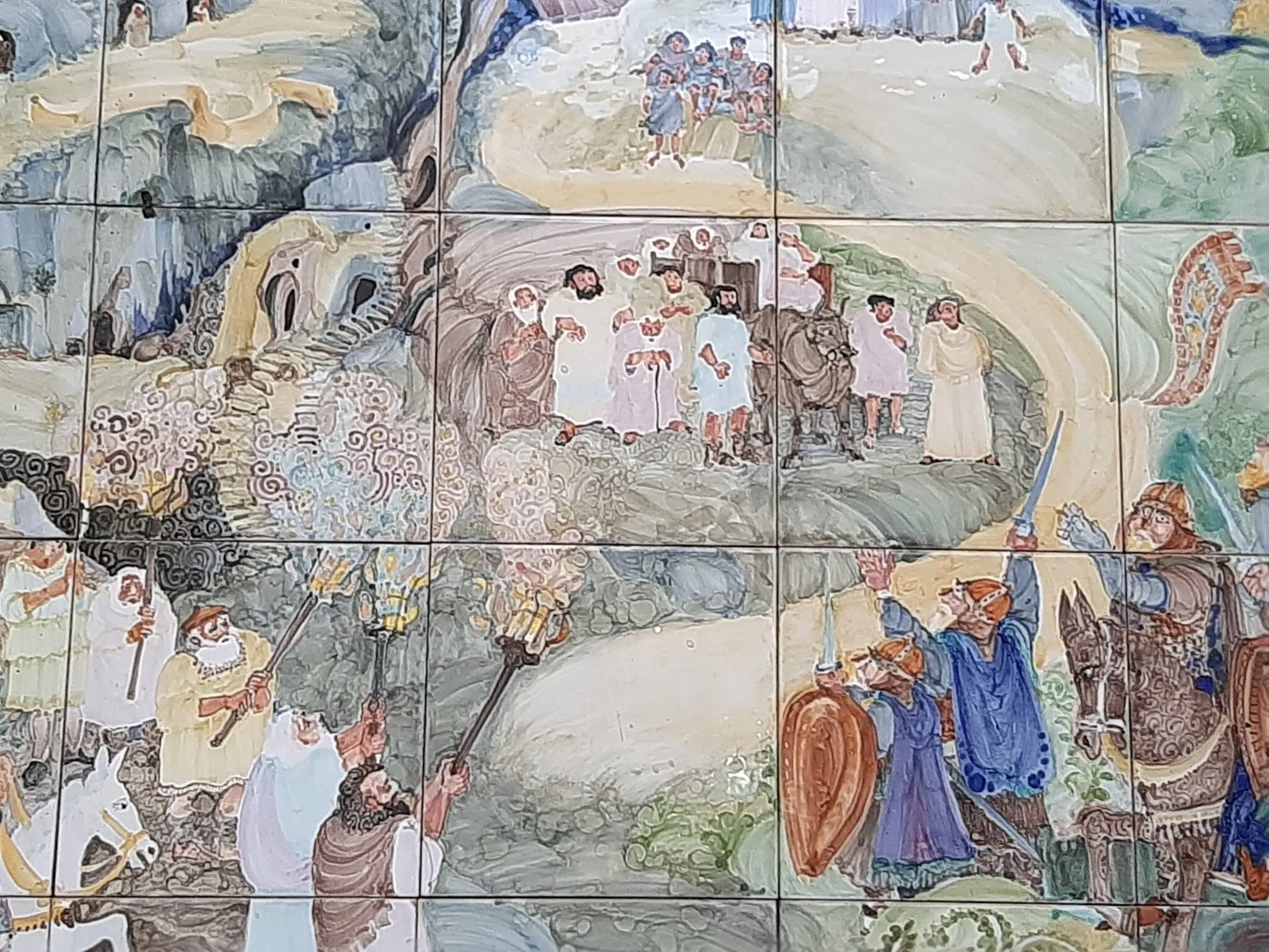 Ogni pannello del ceramista materano Giuseppe Mitarotonda, composto da formelle di vario numero e dimensione, in ceramica maiolicata, evoca ritmi, luci, colori, stagioni antiche e un passato che reca nel fondo la verità più umana ed intima della storia di Matera. La pittura è liquida, limpida, svelta, e per tale ragione, forma e spazio diventano puro colore, quel colore che è un mezzo capace di esercitare un influsso diretto sull’anima.