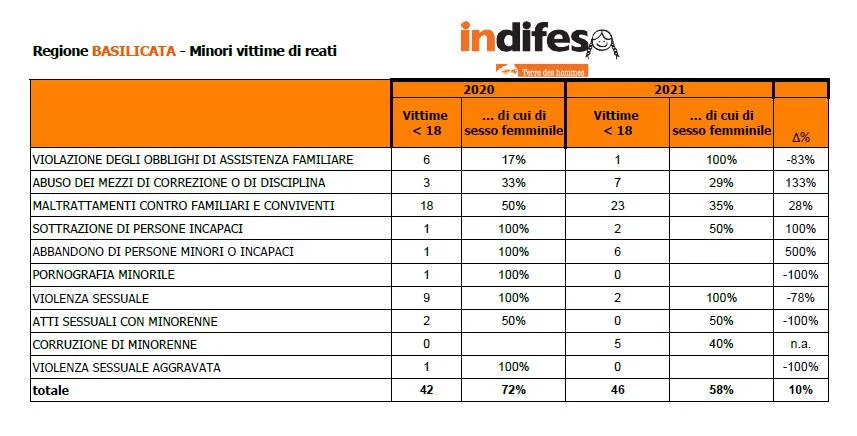 Roma, ottobre 2022Il numero dei reati commessi in danno di minori in Italia nel 2021 (riferiti alle fattispecie esaminate[1]) segna uno sconfortante record, superando per la prima volta quota 6mila. Tra questi sono 47 quelli commessi nella Regione Basilicata, aumentati del 10% rispetto al 2020. Di questi, 23 maltrattamenti (+28% dal 2020) e 2 violenze sessuali (-70% dal 2020), queste ultime al 100% su bambine e ragazze.