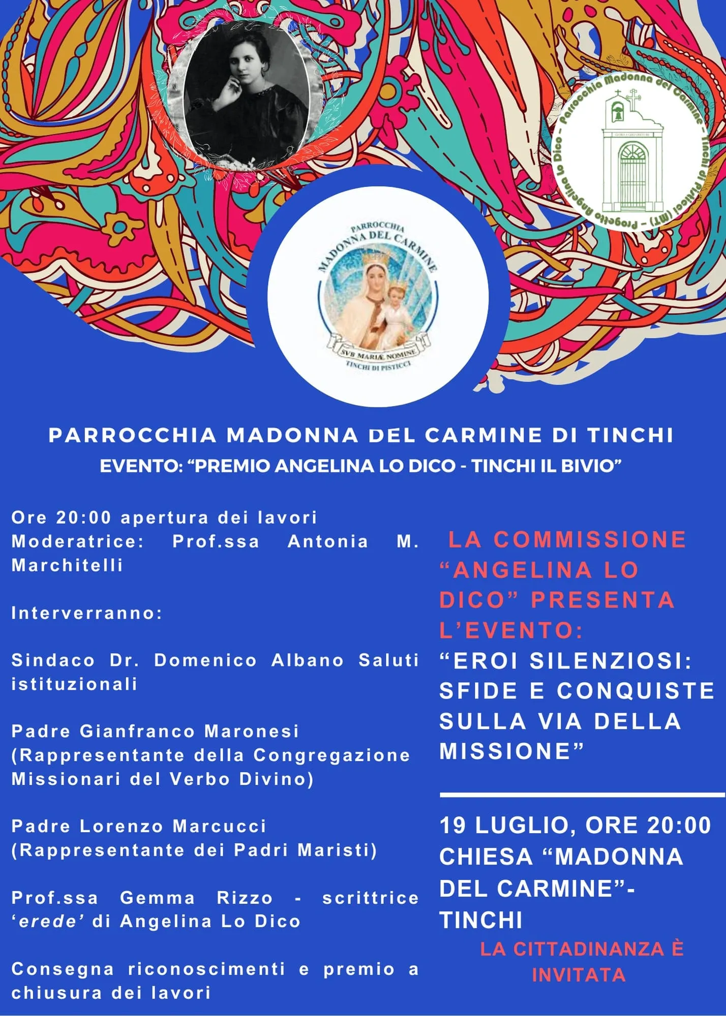 Alle ore 20:00 dello stesso venerdì 19, presso la Parrocchia Madonna del Carmine, si terrà la serata dedicata ad Angelina Lo Dico, l’indimenticata “maestrina santa”. All’evento, dal titolo “Eroi silenziosi: sfide e conquiste sulla via della missione”, coordinato dalla prof.ssa Antonia Maria Marchitelli, parteciperanno il sindaco di Pisticci Domenico Albano, il padre marista Lorenzo Marcucci (già parroco della comunità di Tinchi), Padre Gianfranco Maronese della Congregazione Missionari del Verbo Divino. Ospite della manifestazione la prof.ssa Gemma Rizzo che, dalla Sicilia, porterà la sua personale testimonianza su Angelina Lo Dico. La serata si concluderà con l’assegnazione del Premio “Angelina Lo Dico – Tinchi il Bivio”.