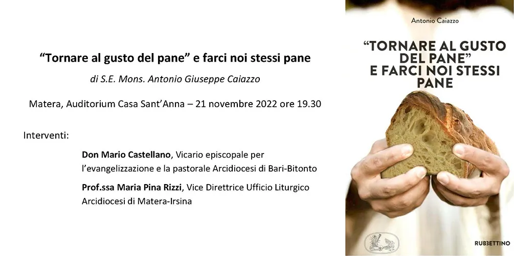 “Tornare al gusto del pane” è il titolo del libro che Mons. Antonio Giuseppe Caiazzo, Arcivescovo della Diocesi di Matera-Irsina, ha scritto in occasione del XXVII Congresso Eucaristico Nazionale e che sarà presentato lunedì 21 novembre alle 19.30 nell’Auditorium di Casa Sant’Anna a Matera.