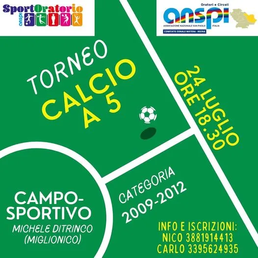 Il torneo si terrà il 24 luglio alle ore 18.30 preso il Campo Sportivo di Miglionico. Per info e iscrizioni contattare i numeri presenti in locandina.