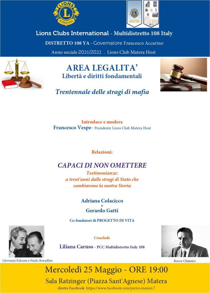 Interverranno sul tema “CAPACI DI NON OMETTERE, Testimonianze: a trent’anni dalle stragi di Stato che cambiarono la nostra Storia” Adriana Colacicco e Gerardo Gatti, fondatori del Movimento Progetto di Vita che da anni contrasta le mafie e ogni forma di criminalità. Introdurrà il presidente del Lions Club Matera Host Francesco Vespe ed infine concluderà i lavori la Past president del Consiglio dei Governatori italiani Liliana Caruso.Il convegno si terrà in presenza ed in remoto attraverso la diretta Facebook: https://www.facebook.com/pietro.mazzei.7