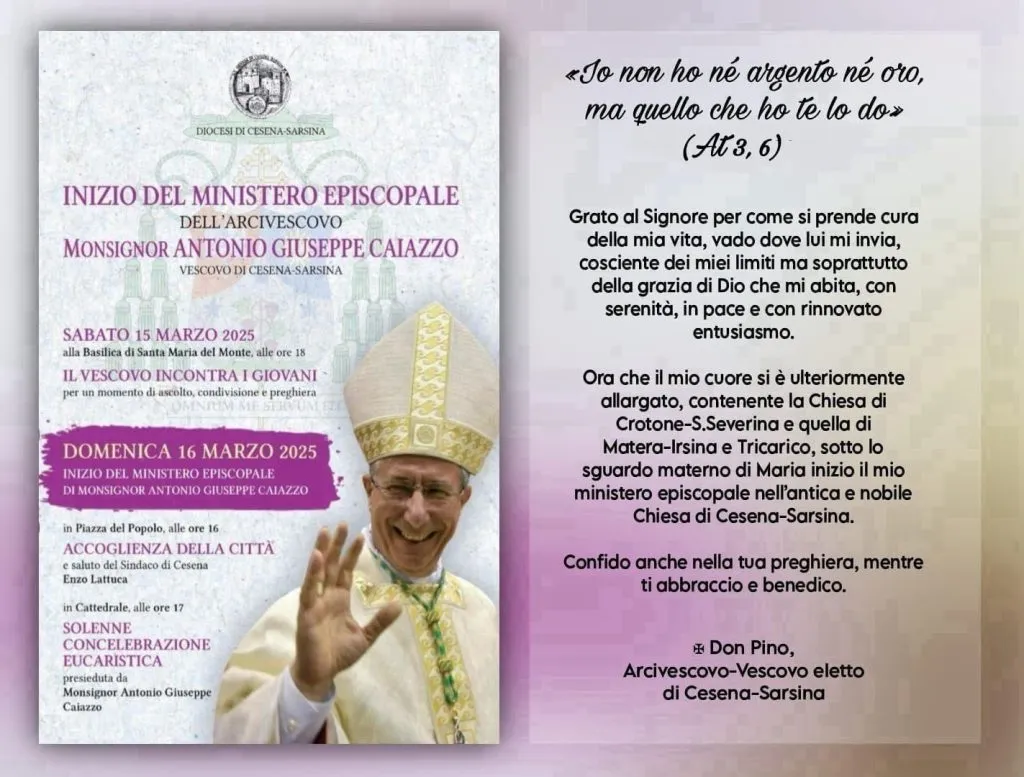 Mons. Antonio Giuseppe Caiazzo, come è ormai noto, domenica 16 marzo prossimo farà l’ingresso nella sua nuova Diocesi di Cesena-Sarsina. Il giorno precedente saluterà i giovani di quella diocesi alle ore 18 presso la Basilica di Santa Maria del Monte. Molte sono state le occasioni in cui il nostro amato don Pino ha avuto modo di salutare le comunità di Matera-Irsina e Tricarico ma questa volta lo fa con un messaggio dettato dal suo cuore “allargato” e in forma di preghiera che non può non arrivare al cuore di tutti noi suoi figli.