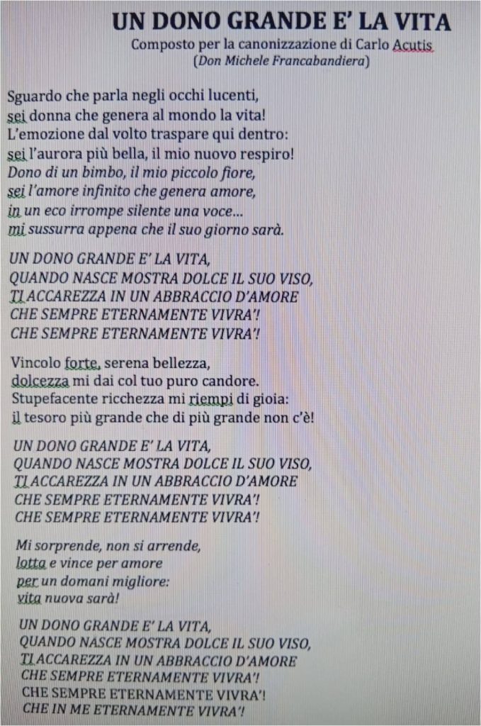 Nell’inciso…”mi sorprende, non si arrende lotta e vince per amore per un domani migliore: vita nuova sarà!”… ho voluto leggere il momento della malattia di Carlo alla luce della vita donata e offerta e vinta per amore a Dio e alla Chiesa.