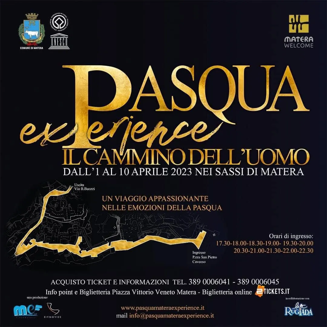 Dall’1 al 10 aprile 2023, ogni giorno dalle ore 17.30 alle ore 22.30, è in programma “Pasqua Experience, il cammino dell’uomo”, un evento di MeF e Bitmovies col patrocinio e il sostegno del Comune di Matera.