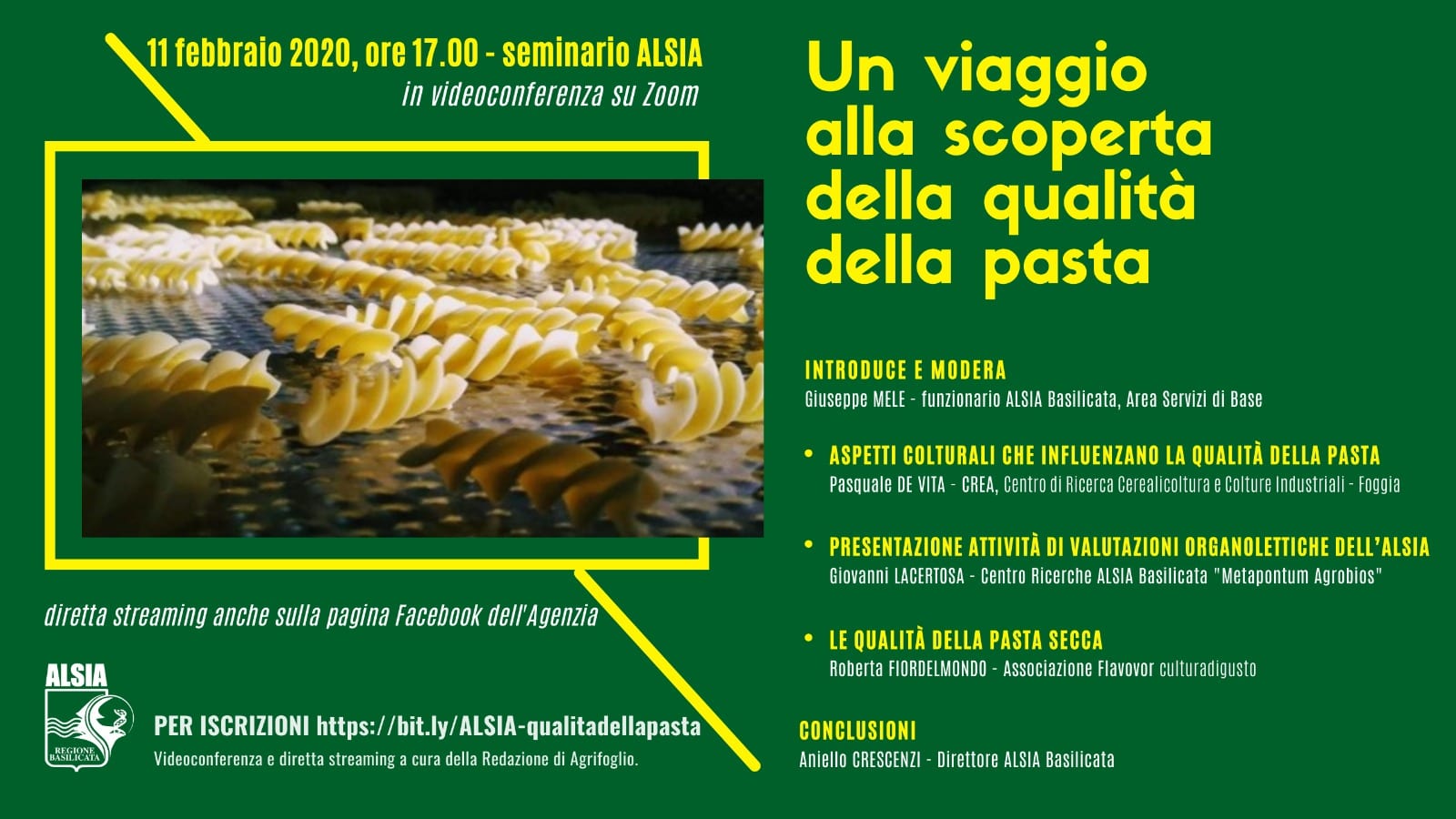 “Un viaggio alla scoperta della qualità della pasta”: sarà questo il tema del seminario organizzato dall’ALSIA, l’Agenzia Lucana di Sviluppo e di Innovazione in Agricoltura, per l’11 febbraio 2021, a partire dalle ore 17.00, in videoconferenza sulla piattaforma Zoom.