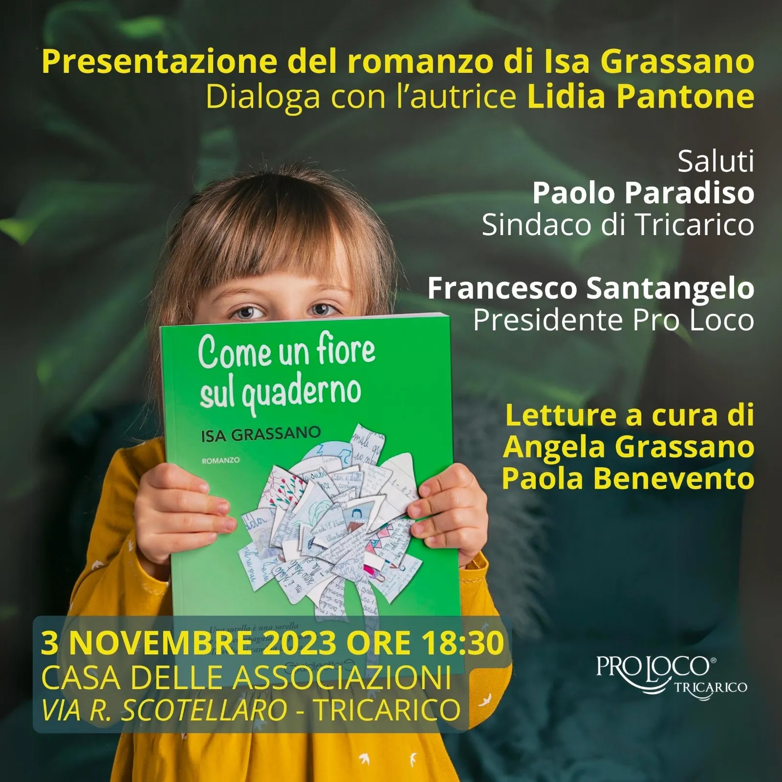 Si prosegue poi sabato 11 novembre al Felp Festival letterature di Policoro (ore 16) con la giornalista Ketty Monzo. E, cosa curiosa, sulla carta d’identità di Isa Grassano, si nota che è nata a Policoro, anche se cresciuta a San Mauro Forte e poi vissuto a Matera.