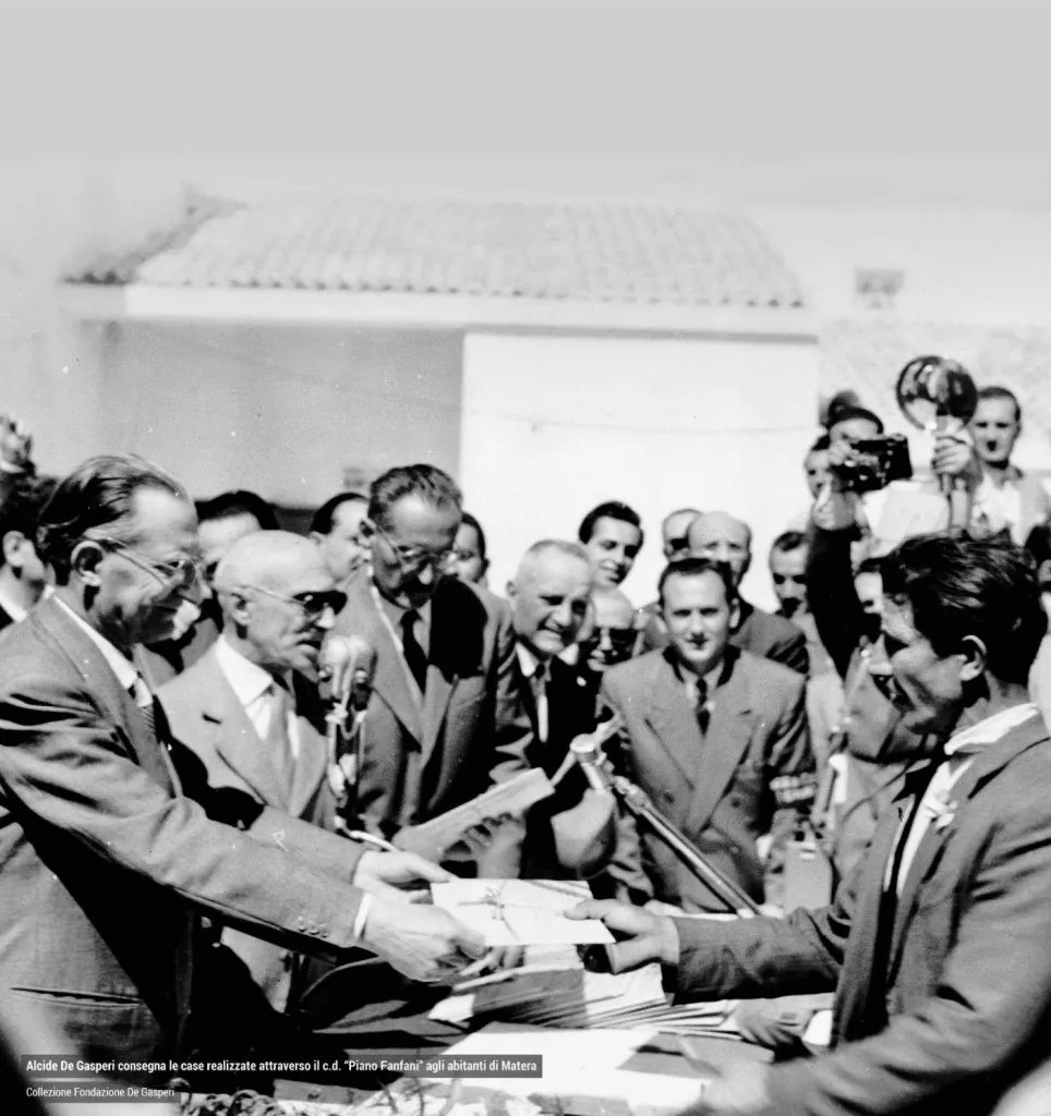 A De Gasperi, dopo la storica visita a Matera del 1950, è legata anche la Legge per lo sfollamento dei Sassi del 1952 cui seguì la realizzazione dei nuovi borghi, a cominciare da La Martella.