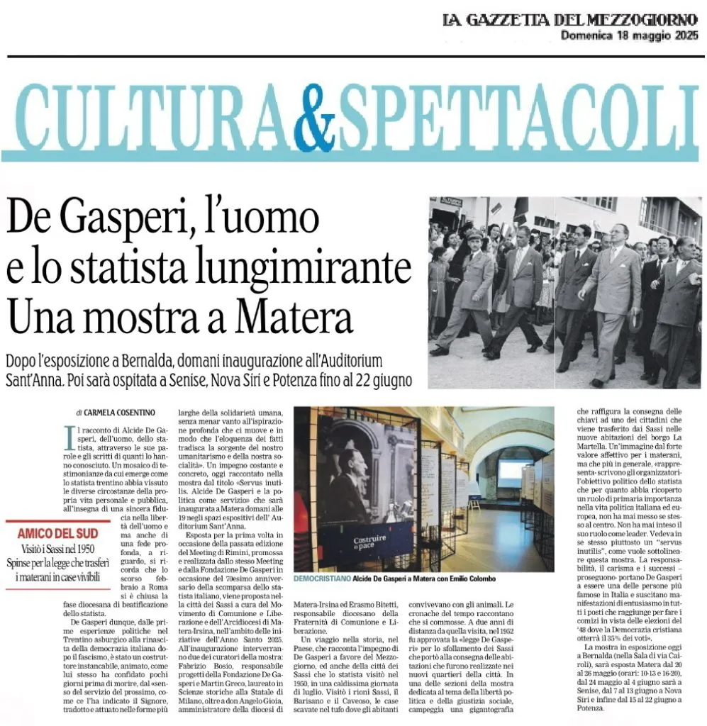 All’inaugurazione della mostra nel capoluogo di regione, in programma il 16 giugno alle ore 18.30 nella Sala A del Consiglio regionale di Basilicata, è prevista la partecipazione di Paolo Alli, Segretario generale della Fondazione Alcide De Gasperi.