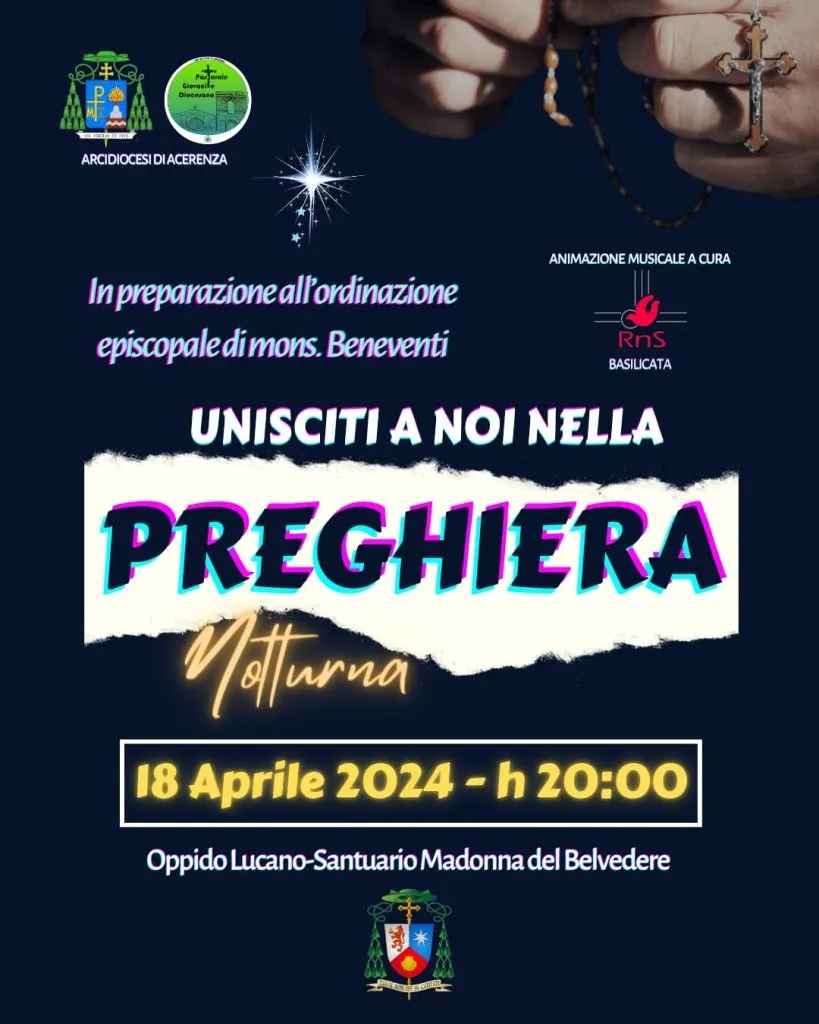 Invito alla partecipazione ad una veglia di preghiera, animata dal Rinnovamento nello Spirito, il 18 aprile alle ore 20 presso il Santuario Madonna del Belvedere ad Oppido Lucano in vista dell'ordinazione episcopale di mons. Domenico Beneventi.