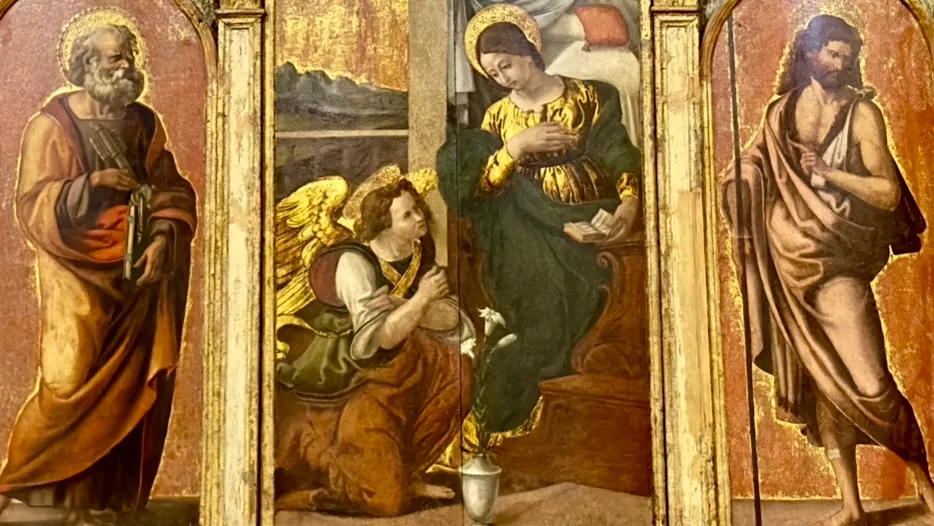 Ascoltare la voce competente del dott. Gabriele Scarcia, il critico d’arte che ci sta guidando in questo percorso attraverso le bellezze di valore meno note della nostra Chiesa locale, rende anche noi protagonisti della scena in cui nella camera da letto – “luogo d’intimità nella vita di ciascuno”, commenta Scarcia – Maria è visitata dall’angelo Gabriele e ascolta. Una interpretazione originale: l’angelo è in basso, più umile di colei che è “umile e alta più creatura” (Dante, Paradiso XXXIII, 2). Mentre, in alto una sorpresa: un particolare che non vi sveliamo e mi fa venire in mente tutte quelle rappresentazioni della Dormitio Virginis che abbondano nei paesi di fede ortodossa che vedono al di sopra di Maria la sua animula che vola al Padre. E il Padre è presente anche in questa rappresentazione, al centro della storia che guarda dall’alto: “Io sono l’alfa e l’omega” è scritto sul libro che il canuto vegliardo presenta all’osservatore, con un cenno benedicente nell’altra mano. C’è tutta la trinità e il tre è la cifra ricorrente della tempera su tavola di Simone.