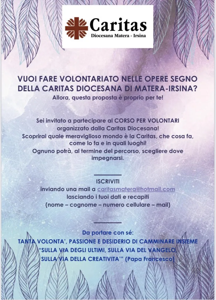 Chi volesse iscriversi al Corso per Volontari organizzato dalla Caritas dovrà inviare una mail all’indirizzo di posta elettronica caritasmatera@hotmail.com riportando i propri dati di contatto (nome e cognome, cellulare, mail).