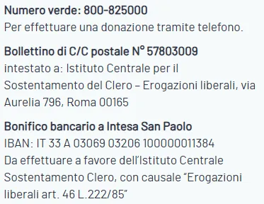 Spesso si crede, erroneamente, che l’obolo domenicale sia sufficiente a garantire il sostentamento del clero. Ma in molte realtà, queste risorse non coprono il necessario. “Fa riflettere il fatto che oggi le offerte deducibili a favore dell’Istituto Centrale per il Sostentamento del Clero (ICSC) – aggiunge Monzio Compagnoni – coprono meno del 2% del fabbisogno annuale complessivo. Dietro ogni sacerdote c’è una vita interamente dedicata agli altri. E ogni offerta, anche la più piccola, è un modo per dire ‘grazie’ e sostenere concretamente i nostri preti, permettendo loro di continuare ad essere presenza operosa nelle parrocchie”.